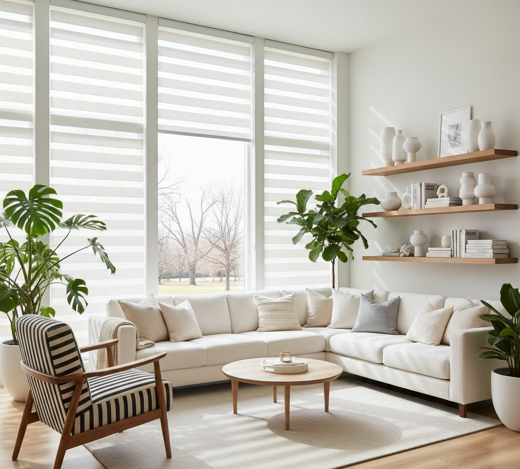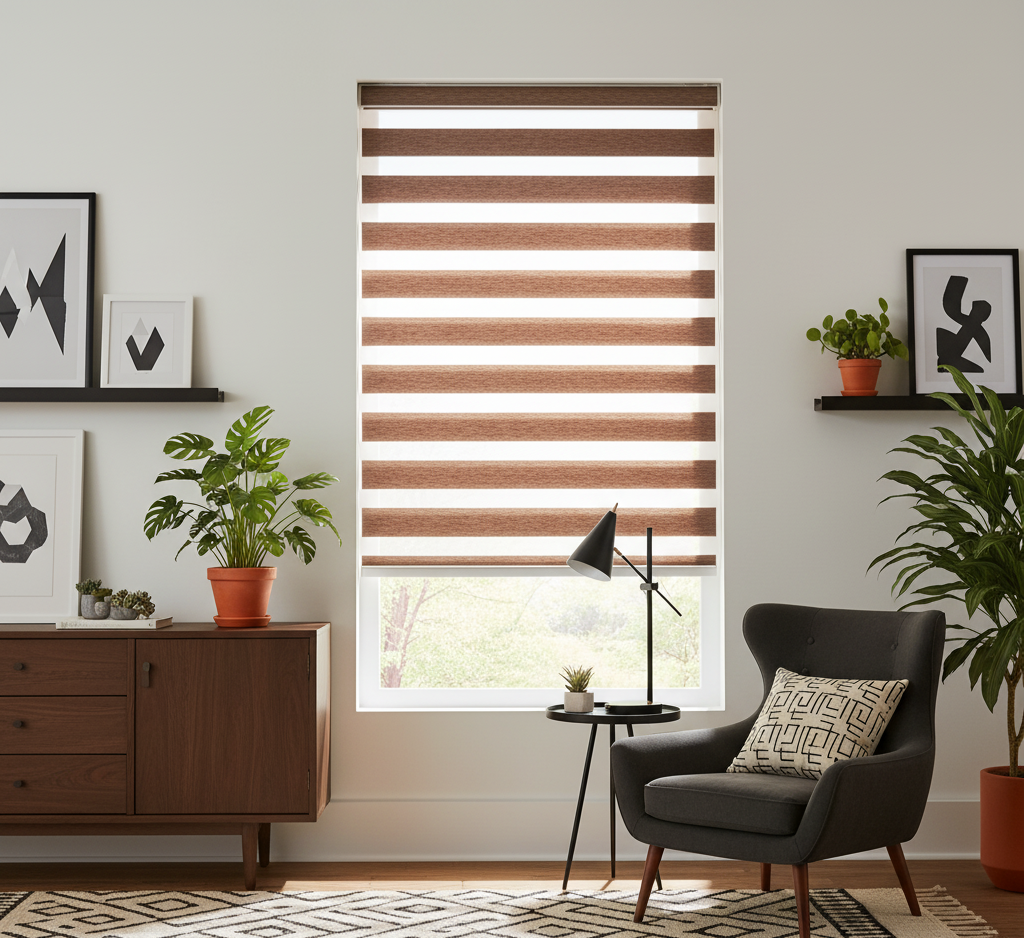 Zebra shades, also called dual or layered shades, are a type of window covering made of alternating horizontal stripes of sheer and opaque fabric. This design allows you to: