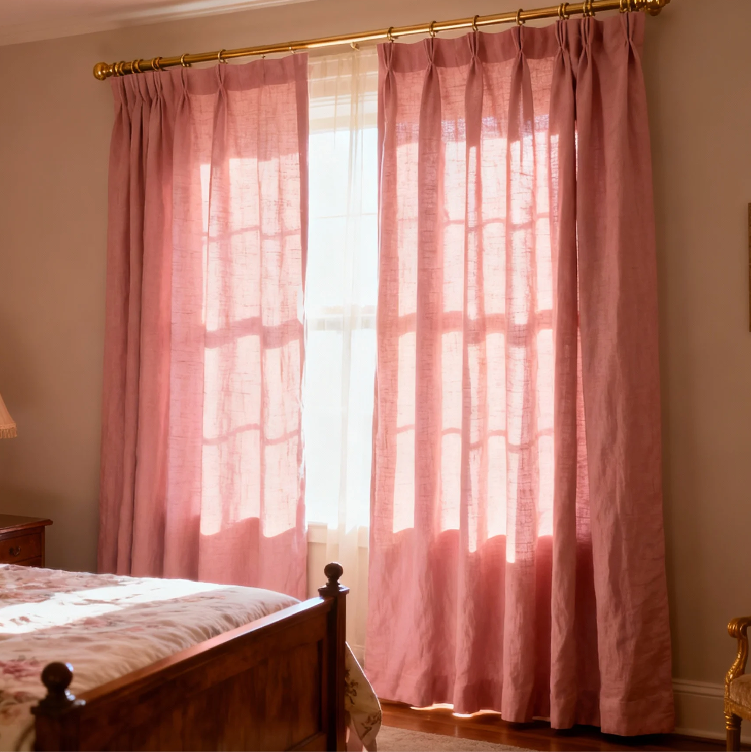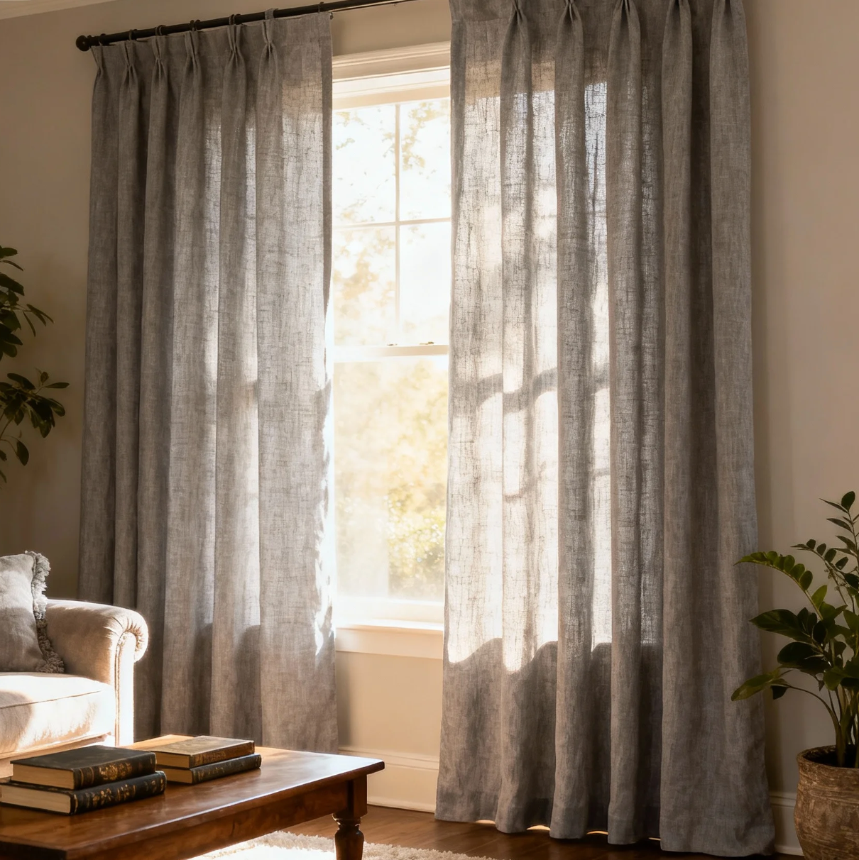 Enhance your home décor with pleated luxury linen-cotton curtains, thoughtfully crafted from a soft and refined fabric.
