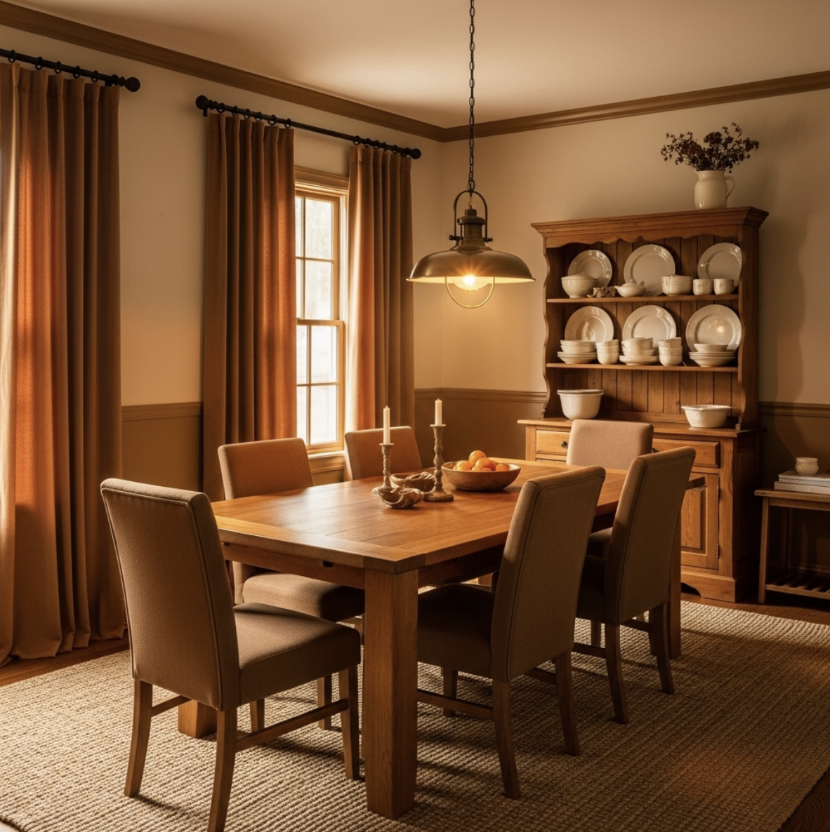 Warm earth tones like terracotta, mustard, or olive green create a cozy, inviting atmosphere—perfect for family meals and gatherings.
