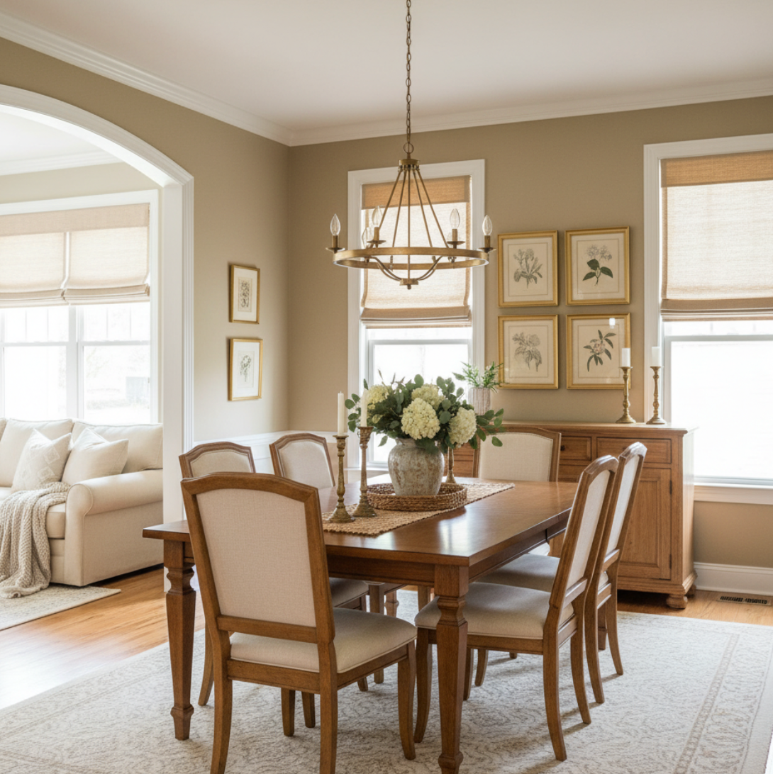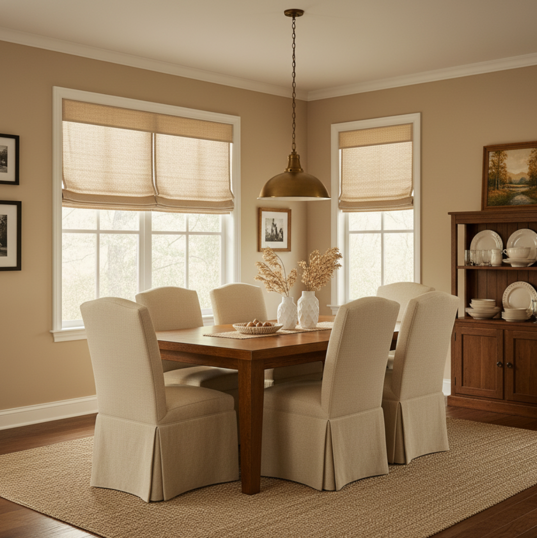 Neutral tones like beige, gray, or white are timeless choices that pair easily with any décor, giving your dining room a simple yet elegant look.