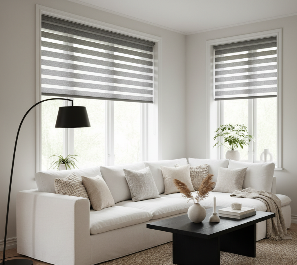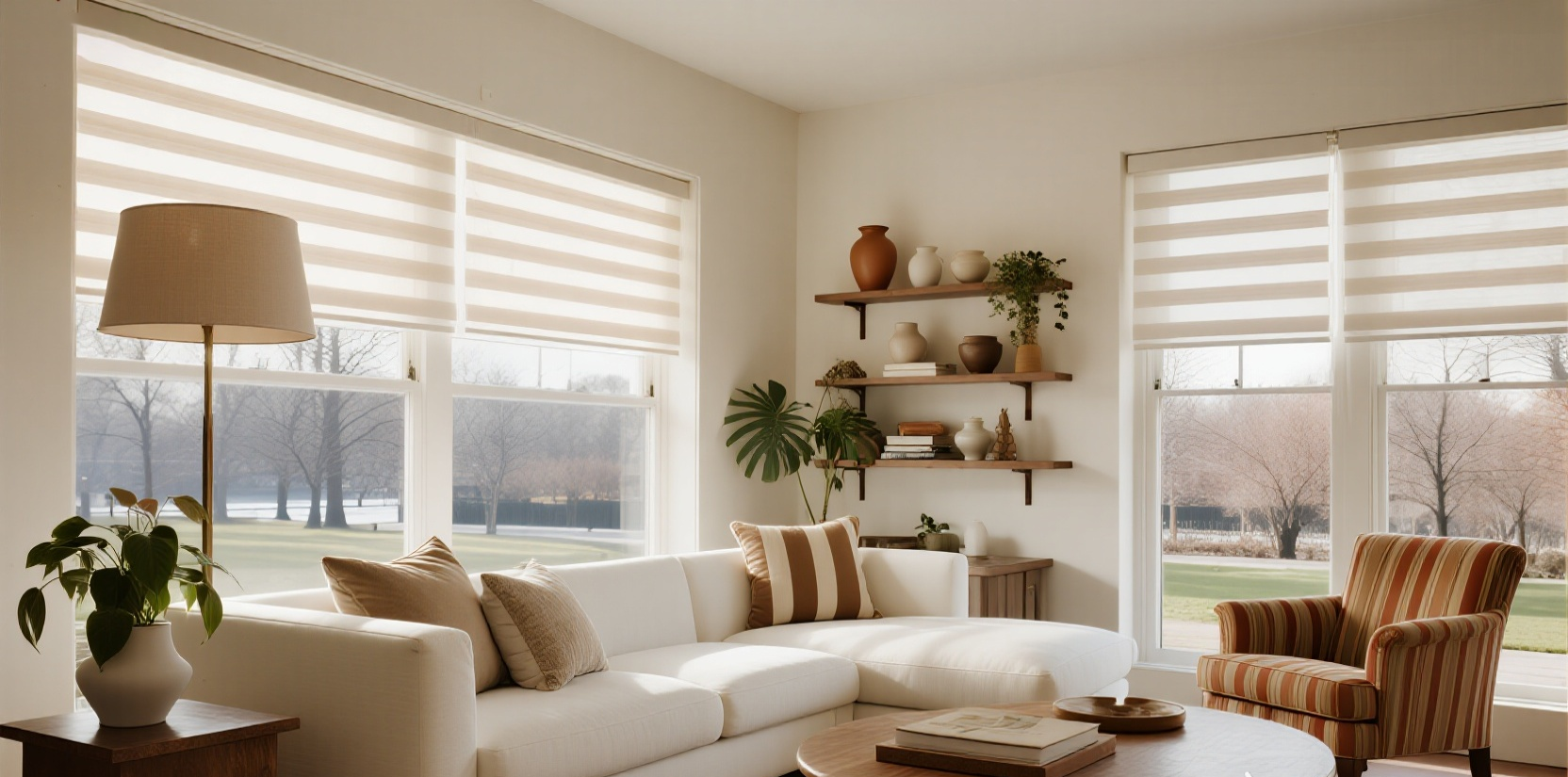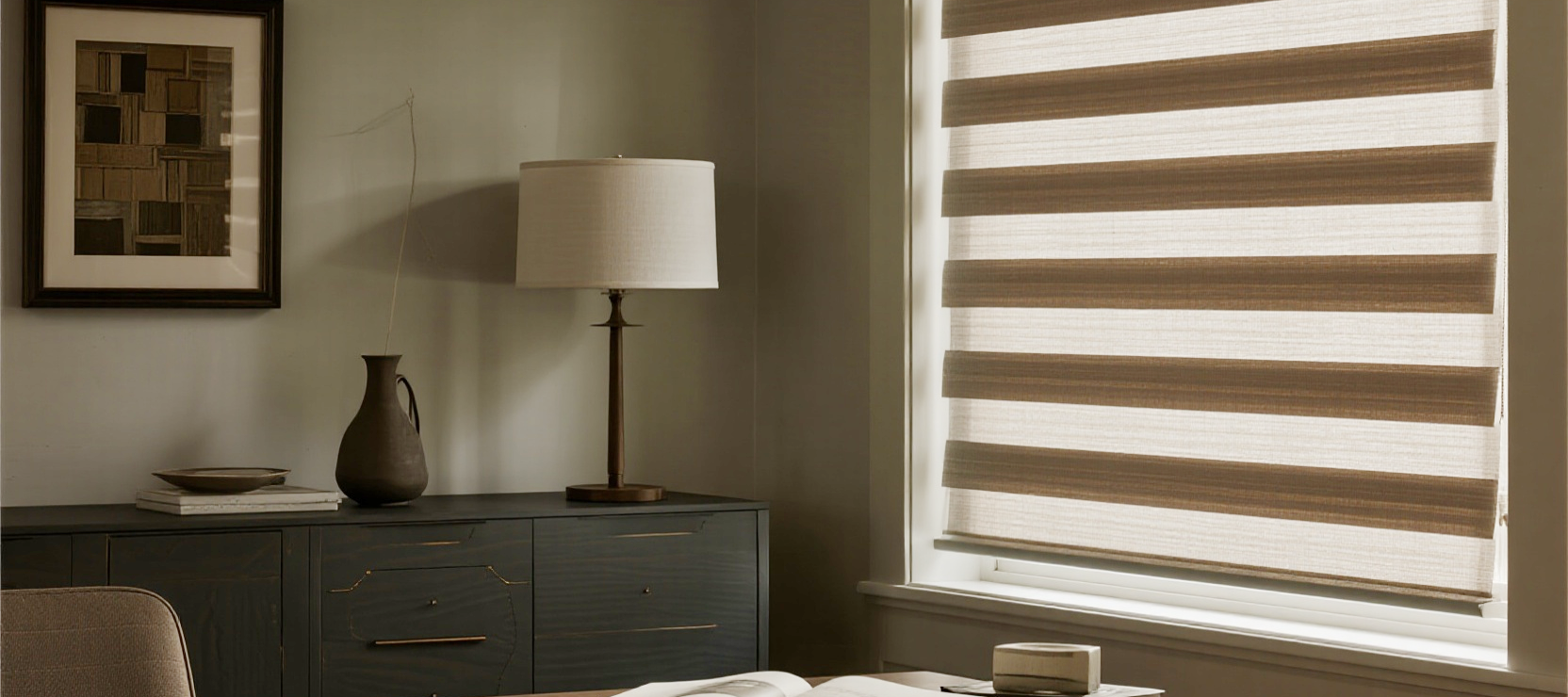 are a type of window covering made of alternating horizontal stripes of sheer and opaque fabric.