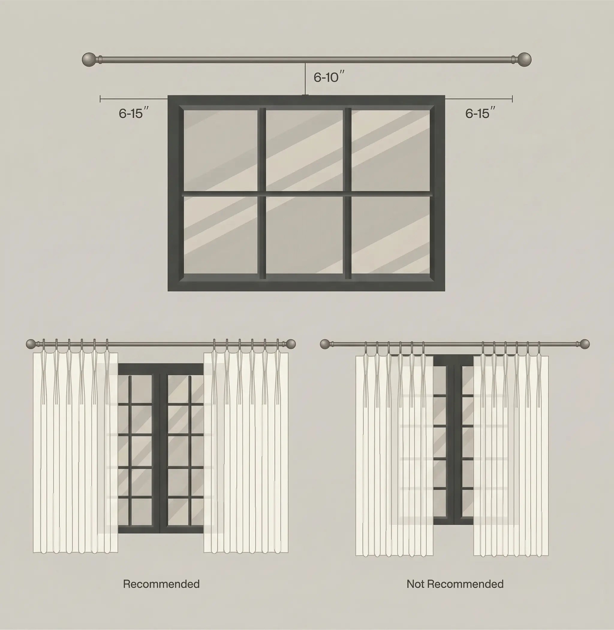Width: Extend 6–15 inches beyond each side of the frame for proper curtain stacking. Mark placement points accordingly.