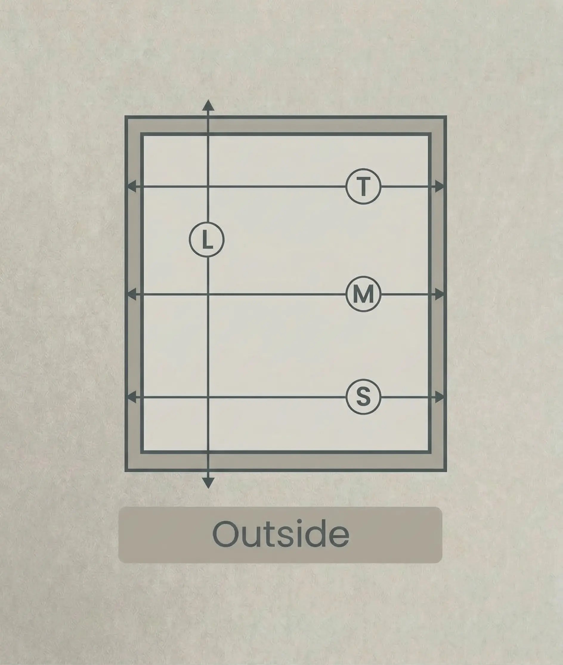 Height: Measure the height inside the frame at three points—left, middle, and right. Take the longest measurement to ensure the shade covers the entire window height.