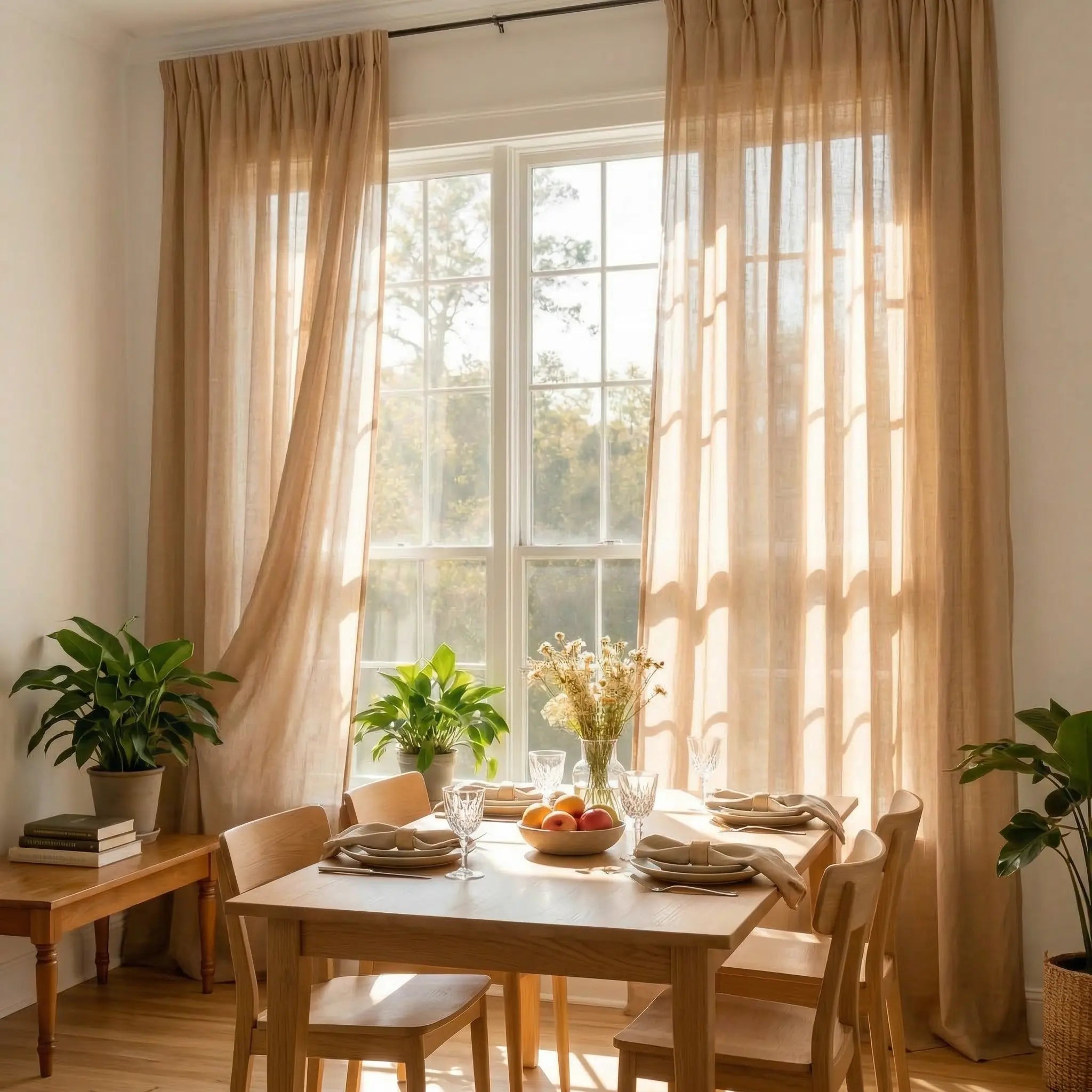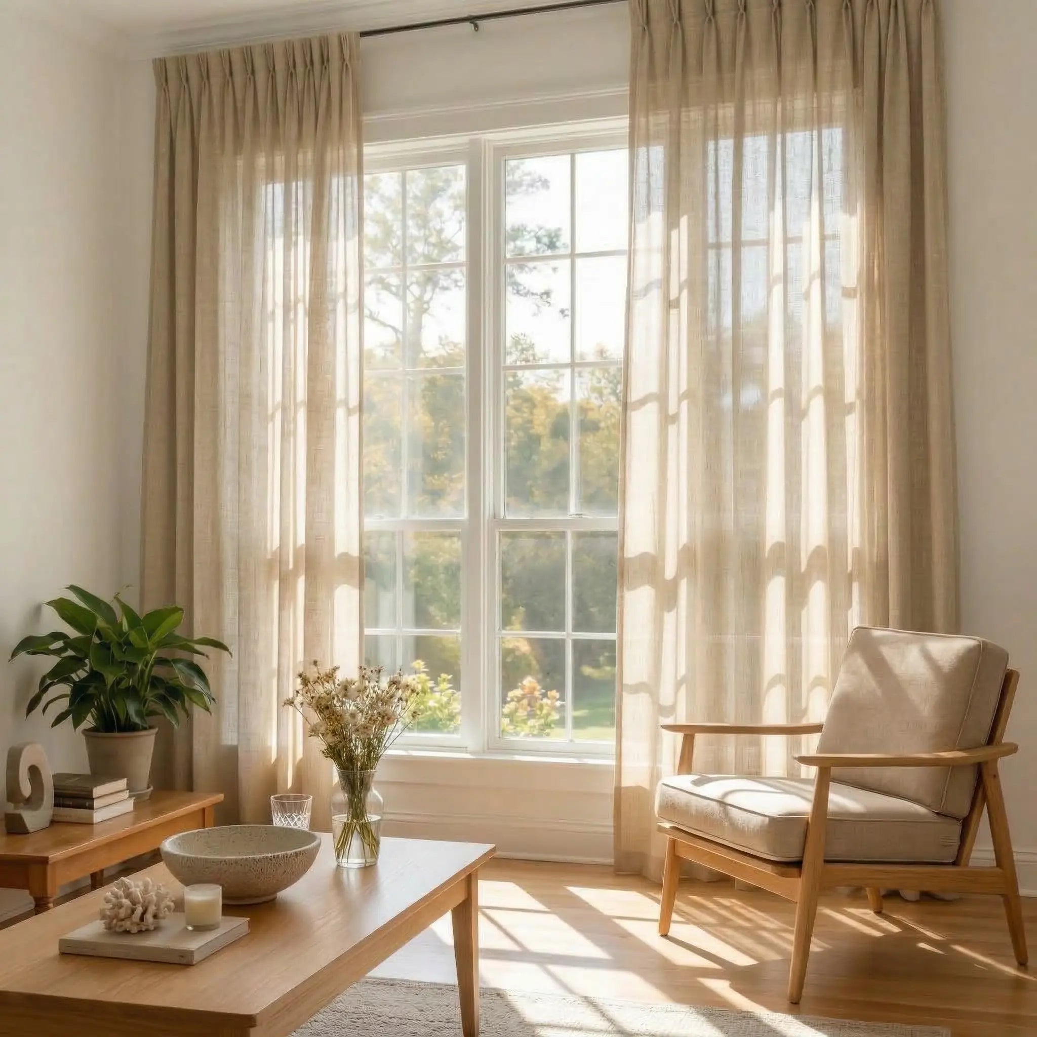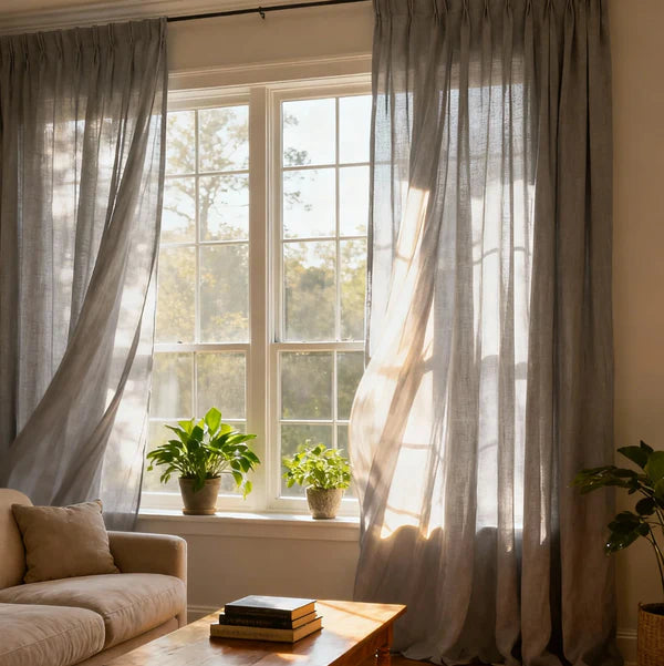 Enhance your home décor with pleated luxury linen-cotton curtains, thoughtfully crafted from a soft and refined fabric.